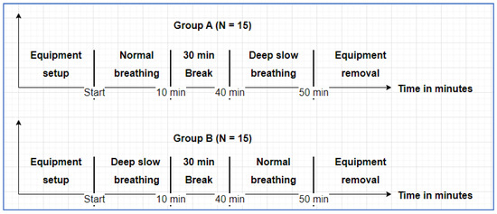 The participants were randomised using an online randomiser tool [49] into either Group A or Group B, wherein data were recorded for normal breathing or DSB first, respectively. The participants were seated on the plinth with the prototype sensors and gold standard devices attached. The participants were requested to stay as still as possible during data collection. The data were collected for 10 min during the normal breathing phase and the DSB phase. In between the two phases, there was a 30 min rest break during which no data were logged. Figure 2 shows the progression of the single data collection session for both groups.