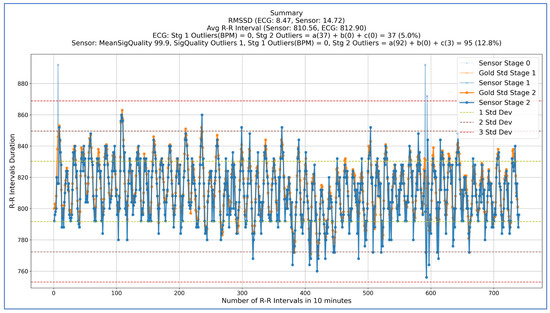 As an example, Figure 3 shows a visualisation of the above algorithm when comparing one participant’s ECG dataset with the corresponding in-ear data during the deep slow breathing phase. The horizontal dashed lines represent 1 (green), 2 (brown), and 3 (red) standard deviations. There were no BPM outliers identified in either dataset. In this example, the mean signal quality for the in-ear sensor was 99.9% with only one signal quality outlier. At Stage 2 of the checks, there were 37 beats (5.0%) identified in the ECG dataset and 95 beats (12.8%) identified in the in-ear dataset as outliers. The average R-R intervals calculated were 812 ms and 810.5 ms for ECG and in-ear, respectively. However, the RMSSD values were 8.47 ms and 14.72 ms, respectively, suggesting that even if the data are time synchronised and look very similar, the error margin in RMSSD calculations can be notable for low-range RMSSD values.