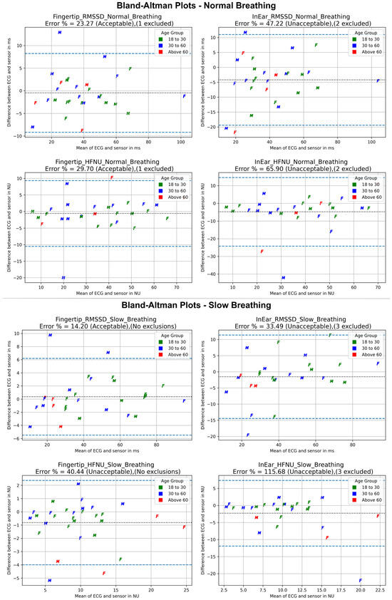 Bland–Altman plots for the fingertip-based and the in-ear sensors are shown on the left and right, respectively. The titles associated with the subplots mention the HRV parameter, breathing protocol, error percentage (LOA), and exclusions. In each subplot, each point, representing each participant, is marked as “M” for male and “F” for female to denote gender. Each data point represents the mean of the measurements (ECG and the respective sensor) for each participant. The colours represent the age bracket of the participant with green denoting age bracket 18–30, blue denoting 30–60, and red denoting above 60. The black dotted line in the middle represents the mean difference or the bias and the dashed blue lines represent the lower and upper bounds of LOAs.