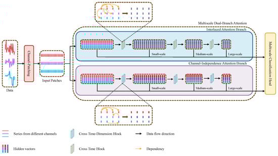 Recent research findings suggest that embedding methods and modeling cross-channel dependencies are important issues for multivariate time series data. PatchTST [] introduces the concept of patching into MTS for the first time and adopts a channel-independent design, achieving significant results. SVP-T [] also divides multivariate time series data into subsequences and models the dependencies in time and channel using a VP layer. Most similar to our work is Crossformer [], which attempts to segment multivariate time series data, model the relationships in time and channel through a two-stage attention mechanism, and design a multilayer Encoder–Decoder to complete the MTSF task. We also adopt a two-stage attention mechanism, but we introduce channel-independent branches and redesign data embedding, multiscale attention, and classification heads to better adapt to the MTSC problem.