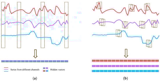 Although these deep learning-based methods have achieved promising results, they often focus solely on capturing temporal dependency while overlooking cross-channel dependency. SVP-T [] attempts to model both time and channel relationship simultaneously, yet falls short in extracting multiscale features. In the context of time series (TS) data, multiscale features are essential for identifying periodic patterns at various time spans (e.g., seconds, minutes, and hours), thereby enhancing the analysis of temporal patterns in the data. Moreover, the data embedding approaches in current MTSC methods mostly involve directly inputting into linear layers. However, in the field of MTS forecasting, many studies suggest that the embedding approach notably influences the model’s representational capacity [,]. Additionally, while certain techniques strive to capture cross-channel dependencies, an excessive fusion of channels may result in information degradation, underscoring the importance of preserving the channel-independent branch.