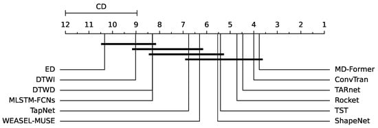 To assess the statistical variances between MD-Former and alternative methodologies across various datasets, we conducted the Nemenyi test based on the “AVG rank” across different datasets. Consistent with prior research [], a Critical Difference (CD) plot was generated to visually represent the distinctions. The CD plot arranges the 12 multivariate time series classifiers along a horizontal line based on their “AVG rank”. As shown in Figure 7, MD-Former demonstrates the best overall performance across different datasets, highlighting its strong robustness across various scenarios.