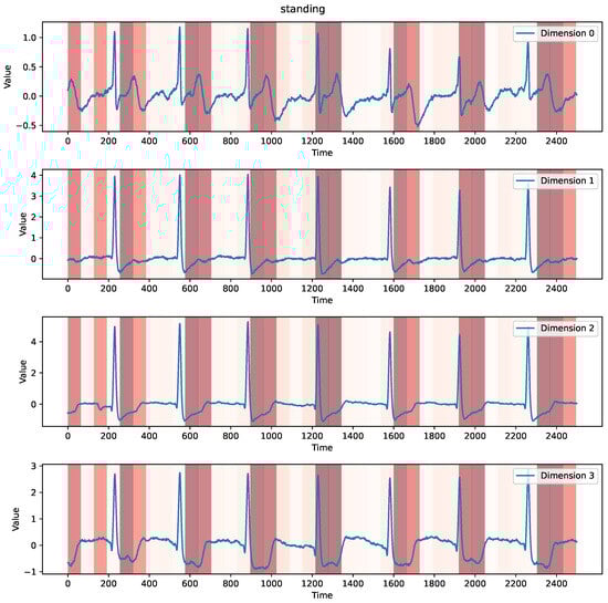 A “standing” instance from the StandWalkJump dataset. The blue lines represent the actual data, with each line corresponding to a different channel (4 channels in total). The background color represents the attention scores of the last layer in the IAB, with darker shades indicating higher scores.