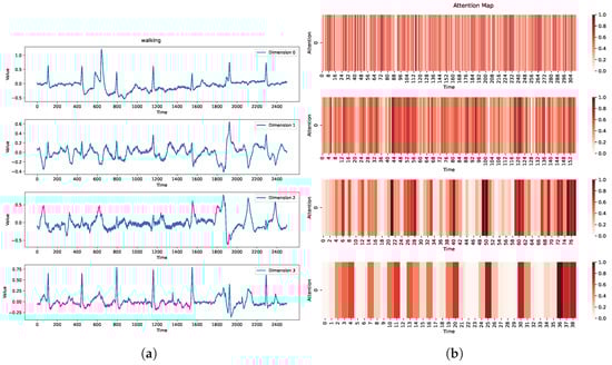 A “walking” instance from the StandWalkJump dataset. (a) Original data, which consist of four channels. (b) Attention scores from different layers of IAB. Time scale increases from top to bottom.