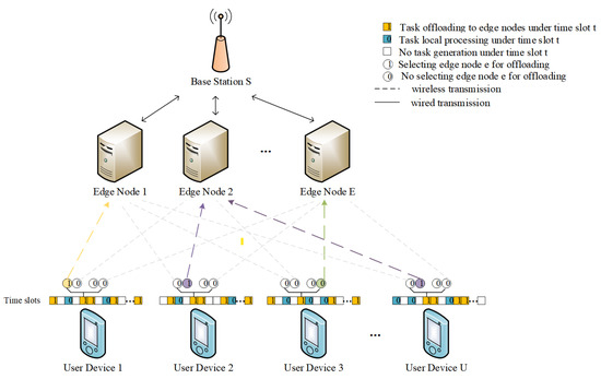 We represent the offloading decision for a task arriving at time slot t as , where indicates local task processing and indicates offloading the task to an edge node for processing via wireless channel transmission. When a task is selected for offloading to an edge node, let represent whether the task generated by user device u is allocated for processing at edge node e during time slot t. Specifically, , where confirms that the task is processed at edge node e and confirms that it is not. The variable satisfies the following relation: