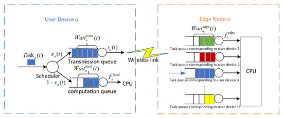 Prior to the conclusion of time slot t, user device u generates a new task . This task undergoes evaluation by the scheduler, which ascertains the offloading decision, and is then positioned into the appropriate queue at the commencement of the ensuing time slot. If is selected for local processing, it is slotted into the computation queue of user device u for execution. On the other hand, if the task is destined for offloading to edge node e, it is initially placed in the transmission queue of user device u before being relayed to the corresponding queue on edge node e for additional queuing and subsequent processing through the wireless link. This process is illustrated in Figure 2. For the sake of simplicity, we make when no task is generated during time slot t.