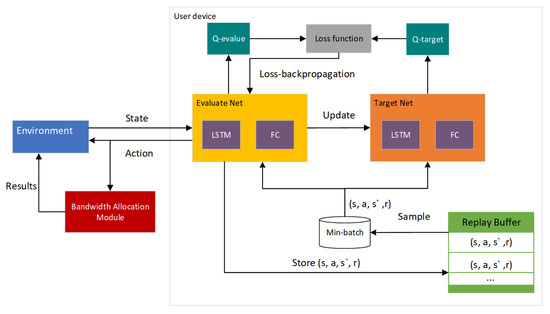 A standard Markov decision process [40] is typically defined as a quaternion , where S represents the set of states observed from the environmental system, A represents the set of actions that the agent can perform depending on the state of the environment, is the state transition probability function, and R is the reward that is obtained by the agent executing an action at state s. The specific details of each element in our Markov decision process problem model are as follows.