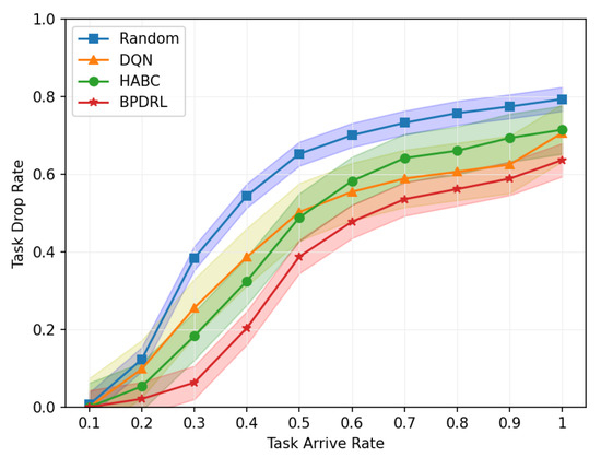Table 4, Table 5 and Table 6 demonstrate that the BPDRL algorithm achieves a substantial improvement in task drop rate, with an average reduction of 37% compared to the HABC algorithm (p-value = 0.005). This result highlights the BPDRL algorithm’s enhanced ability to handle high-load tasks and mitigate task losses caused by insufficient resources. Furthermore, when compared to the DQN algorithm, the BPDRL algorithm achieves a 47% reduction in task drop rate (p-value = 0.000), further underscoring its superior performance in resource-constrained environments. Notably, the BPDRL algorithm reduces the task discard rate by 63% relative to the Random Offloading strategy (p-value = 0.000), a significant improvement that emphasizes its capability to make intelligent task offloading decisions in dynamic and complex environments. The BPDRL algorithm also demonstrates significant advantages in reducing system latency. Compared to the HABC algorithm, it achieves an average latency reduction of 9% (p-value = 0.010), indicating its ability to expedite task processing and thereby minimize user waiting times. Similarly, the BPDRL algorithm reduces system latency by 9% compared to the DQN algorithm (p-value = 0.008), further validating its effectiveness in optimizing task processing times. Moreover, the BPDRL algorithm achieves a substantial 20% reduction in system latency relative to the Random Offloading strategy (p-value = 0.000), highlighting its notable superiority in minimizing latency in dynamic and resource-constrained environments.