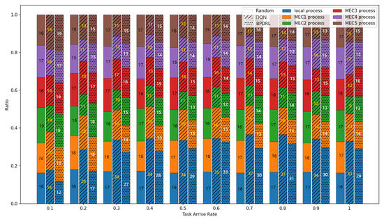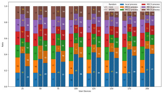 Figure 10 shows the comparison of the system task drop rate under different network scales defined by user device quantities. As the number of user devices increases, task drop rates for all schemes rise accordingly. However, our proposed approach consistently achieves the lowest task drop rates in scenarios with a large user base. This is due to the algorithm’s capability for each user to effectively predict real-time load dynamics at edge nodes, thereby fully utilizing the system’s communication and computing resources. This ensures dynamic load balancing and optimal resource utilization. When the number of user devices reaches 200, our approach reduces the task drop rate by 51.4%, 19.7%, and 35% compared to the Random, DQN, and HABC algorithms. Figure 11 compares the percentage of tasks processed locally or offloaded to the edge nodes relative to the total tasks generated over a given time period under different network scales. While the Random strategy distributes tasks evenly, it overlooks system dynamics, leading to higher task drop rates. In contrast, our approach dynamically maintains load balance among edge nodes based on real-time load levels, achieving a lower task drop rate. Compared with the DQN strategy, our approach tends to offload more tasks to the edge nodes and achieves a more balanced distribution of offloading decisions among the edge nodes, offering a significant advantage in addressing the load balancing challenges of edge nodes.