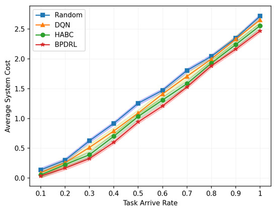 Figure 12 illustrates the variation in average system cost across different network sizes when the delay weighting parameter is set to 0.7. The Random algorithm consistently maintains a high system cost, reflecting its suboptimal performance in resource utilization and task allocation. While the DQN algorithm achieves a lower system cost compared to the Random algorithm, its performance deteriorates significantly as the number of user devices increases, indicating limited adaptability to large-scale user networks. In contrast, the HABC algorithm demonstrates greater stability across varying network sizes, with only a slight increase in system cost as the number of user devices grows. However, the BPDRL algorithm consistently achieves the lowest system cost among all the baseline methods, with the most moderate growth trend as network size expands. These findings underscore the superior efficiency and robustness of the BPDRL algorithm in optimizing resource allocation and task offloading, effectively mitigating the impact of increased network scale on system performance.