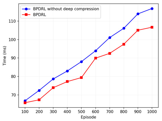 Figure 15 compares the runtime of the algorithm with and without deep compression techniques. The horizontal axis represents training episodes, and the vertical axis indicates the average runtime per training episode every 100 episodes. The average runtime increases with training episodes, but the model with deep compression consistently shows lower runtime. Over 1000 training episodes, the algorithm with deep compression reduces runtime by 7.6% compared to the non-compressed version, with only a 3.5% reduction in task drop rate. The results demonstrate that the deep compression technique enhances the operational efficiency of the model while preserving its performance. Although pruning and quantization remove certain parameters, potentially impacting model accuracy, experimental verification reveals that the pruned and quantized model maintains a low task discard rate even under high task arrival rates. This highlights the model’s ability to sustain both accuracy and stability. Furthermore, as a 32-bit floating-point number requires 4 bytes of storage while an 8-bit integer requires only 1 byte, 8-bit quantization significantly reduces the model’s storage requirements and runtime memory footprint. This compression makes the model more suitable for deployment on resource-constrained devices. Thus, we deem the integration of deep compression techniques into the model to be beneficial.