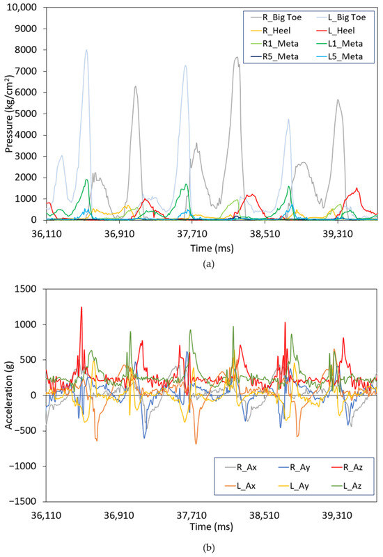 (a) Example of the pressure sensor output during the G2R gear for participant A; (b) Example of the acceleration (from IMU) during G2R for participant A. In both cases, R refers to the right and L to the left feet.