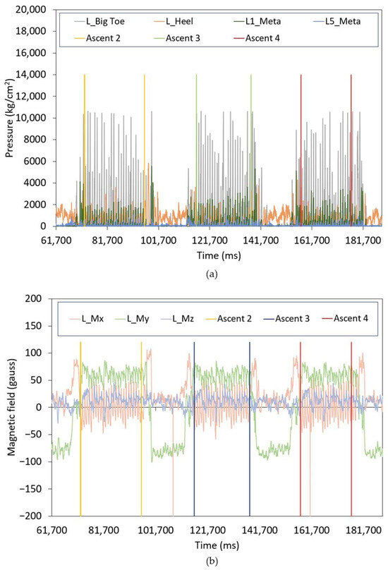 Example of ascent labelling for (a) left foot pressure sensors; and (b) left foot magnetometer sensor.