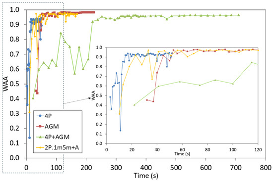Evolution of the WAA for the configuration with four pressure sensors (4P), with only inertial sensors (AGM), for the joined configuration of both types of sensors (4P + AGM), and finally for the simple configuration 2P.1m5m + A.