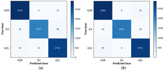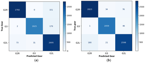 Confusion matrix for gear classification with different combinations of inertial and pressure sensors: (a) 4P + AGM configuration; (b) 2P.1m5m + A configuration.
