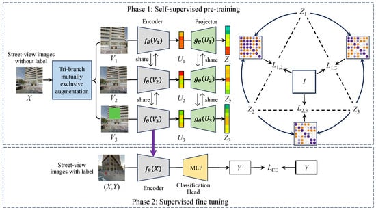 As the volume of urban street-view image data rapidly expands, a crucial issue emerges. Compared to the vast amount of data, there are a lack of corresponding semantic annotations. The manpower and resources required for large-scale and high-quality annotations are considerable [8]. While some open crowdsourced geographic information platforms (e.g., OpenStreetMap, OSM) have been employed to alleviate this issue by assigning semantic labels to corresponding SVIs (e.g., Google Street View) [9] through geographical location matching, disparities in coordinate systems among different systems and the inconsistent quality of crowdsourced annotation still result in a scarcity of high-quality annotations. For example, ref. [9] provides only approximately 20,000 sample annotations for nearly 140,000 SVIs. The existence of this problem presents a formidable obstacle to effectively classifying these massive amounts of street images. When confronted with label scarcity in supervised learning, self-supervised Learning (SSL) methods [10,11,12,13,14,15,16,17] demonstrate immense potential. SSL autonomously introduces latent supervisory signals by treating each sample and its variants as separate classes. Through learning from these “self-supervised signals”, SSL effectively explores and represents the internal structure of massive data without semantic annotations. However, due to the absence of task-specific guidance during training, SSL often requires the application of various special tricks in order to avoid model collapse. For instance, contrastive learning [10,11,12,13] relies on large-scale negative sample pairs to constrain the training process, while predictive learning [14,15,16] achieves model simplification by not requiring negative sample pairs but relying on complex training techniques such as self distillation [14,16] and alternating stop-gradient [15], etc. In recent years, SSL has been used in the field of remote sensing [18,19,20,21,22,23,24], where pre-training methods typically incorporate the aforementioned techniques. However, there is limited research on SSL for SVIs. As a special type of scene imagery with limited visual elements but diverse arrangements and forms of elements, urban street-view imagery contains both fine-grained visual features and high-level abstract semantics simultaneously [25]. This presents a greater challenge for model pre-training using SSL.