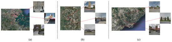 - City-Scale Maps (CSM (CSM & BIC_GSV: https://syncandshare.lrz.de/dl/fiTFS5He9bZsR4Urh8hZGDGg/BIC_GSV.tar.gz (accessed on 25 February 2025))) [9]: The CSM dataset is comprised of 116,491 samples collected from major cities in the United States and Canada, including Boston, Calgary, and Toronto. The specific geographical locations of three samples from each of these cities are presented in Figure 3.