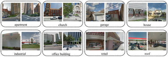 - BIC_GSV: There are a total of 19,658 samples in the BIC_GSV dataset, which is categorized into eight urban ground object classes: apartment, church, garage, house, industrial, office building, retail, and roof. Sample images and detailed information are shown in Figure 4 and Figure 5, respectively.