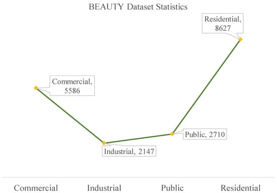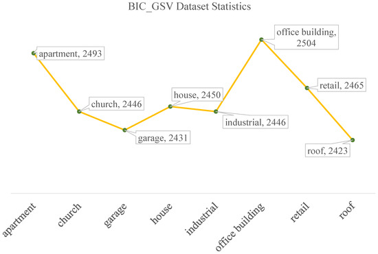 Figure 5. Statistics of BIC_GSV dataset. - BEAUTY (BEAUTY: https://pan.baidu.com/share/init?surl=nSPU68H36CMsn5pboD5e9A&pwd=T78D (accessed on 25 February 2025)): The BEAUTY dataset consists of 19,070 samples in total. It is divided into four abstract functional zones, namely commercial, residential, public, and industrial. Examples from the BEAUTY dataset are shown visually in Figure 6, with detailed information provided in Figure 7.