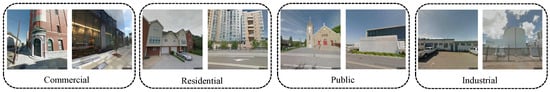 The advancement of deep learning (DL) and CV has made it possible to automatically and efficiently extract high-level semantic information from image data. The application of SVIs in various fields has primarily benefited from these advancements. A series of innovative DL algorithms has emerged [29,30,31,32,33], laying a solid foundation for urban street-view image analysis. Ref. [34] employed convolutional neural networks (CNNs) to develop an indoor/outdoor classifier for ground-level images, which were then used to identify eight parcel-based land use categories within Stanford University’s campus. As supplementary to remote sensing data, SVIs were used to map land use at the parcel level in a megacity [35]. Urban buildings were classified into eight categorizes by using detailed building function information from OSM to mark buildings in SVIs [9]. The types of buildings and their materials were automatically detected by employing CNNs [36], which provided essential references for enhancing seismic risk assessment and urban planning. An ensemble learning method was proposed by [37] to address urban land classification tasks involving multiple data sources (e.g., RS, SVIs). Ref. [25] designed a “Detector–Encoder–Classifier” framework, which acquires building bounding boxes from the detector and subsequently encodes contextual information to partition urban functional zones. Additionally, Ref. [38] introduced a multimodal strategy that integrates visual and language modalities for fine-grained land use classification, using SVIs and spatial context-aware land use descriptions.