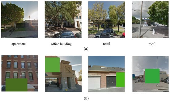 As depicted in Figure 8a, buildings are hidden by trees in the immediate vicinity. In response, a data augmentation method, SVCO, was devised (see Figure 8b). It is based on a comprehensive analysis and understanding of the dataset’s attributes. Since the dataset mainly consists of street-level images, severe occlusion issues are primarily caused by trees. Therefore, SVCO is included as one of the branches in Tri-MExA to better emulate common visual obstacles encountered in real world scenarios.