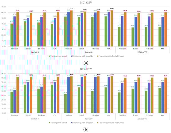 A reasonable explanation for this phenomenon is that OA reflects the overall classification accuracy of a model across all classes, while precision and recall focus on the classification accuracy of negative and positive instances, respectively. As shown in Figure 7, the problem of class imbalance existed in the BEAUTY dataset. The feature representations extracted from the shallow ResNet18 model were insufficient. Despite the similar values of OA and recall, more false positives were generated by the model during positive instance predictions. This resulted in lower precision values. The overall results of the ResNet50 model were better due to its superior feature extraction capabilities. Although the results were more consistent when using the strategy of fine-tuning with ImageNet, there was still a gap between OA and precision when using the training-from-scratch strategy. The performance of Tri-ReD in EfficientViT outperformed both training from scratch and fine-tuning with ImageNet-pre-trained weights. On the BIC_GSV dataset, OA improved by 25.91% compared to training from scratch and 8.25% compared to ImageNet pre-training. On the BEAUTY dataset, OA rose by 24.11% and 10.67%, respectively. However, its overall performance was slightly lower than ResNet50, which may be attributed to the transformer architecture. Although transformer models excel with large-scale data, they may not fully take advantage of their advantages in smaller datasets or tasks with more localized features.