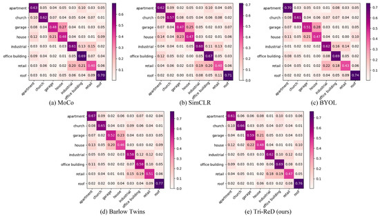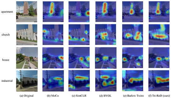 Figure 10 and Figure 11 present the visualization results of other SSL methods and the Tri-ReD method using the ResNet18 model. The confusion matrix of different SSL methods on the BIC_GSV dataset is shown in Figure 10, while the class activation heatmap for partial samples based on Grad-CAM [48] is shown in Figure 11. It is evident that Tri-ReD outperformed other SSL methods in five to seven categories by observing the confusion matrix in Figure 10. Combined with the heatmaps in Figure 11, we can see that Tri-ReD focused more accurately on the relevant regions. These results highlight the exceptional capabilities of Tri-ReD.