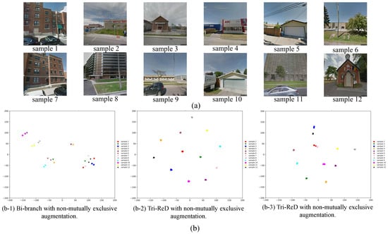 t-SNE visualization of feature distributions for 12 samples from CSM dataset: (a) sample presentation; (b) t-SNE visualization of feature distributions; (b-1) bi-branch strategy with non-mutually exclusive data augmentation; (b-2) Tri-ReD strategy with non-mutually exclusive data augmentation; and (b-3) Tri-ReD strategy with mutually exclusive data augmentation.
