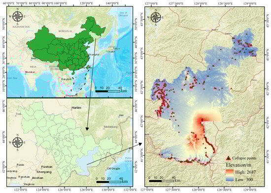 The study area is located in the southeastern part of Jilin Province, with geographical coordinates ranging from 41°09′ to 43°24′ N latitude and 127°25′ to 128°56′ E longitude. This region encompasses Changbai, Antu, and Fusong counties, covering an approximate area of 16,080.8 km2. Situated in the heart of the Changbai Mountains, the area is characterized by mid- to high-mountain topography and serves as a major source for the Songhua and Yalu Rivers. Figure 1 illustrates the geographic location of the study area and the spatial distribution of historical collapse hazards. The region’s complex and varied geography, pronounced topographic relief, and frequent seismic activity contribute to its susceptibility to natural hazards.