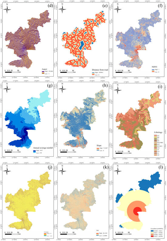 (a) Elevation; (b) distance from faults; (c) distance from river; (d) aspect; (e) distance from road; (f) NDVI; (g) annual average rainfall; (h) slope; (i) lithology; (j) curvature; (k) TWI; (l) exceedance probability.