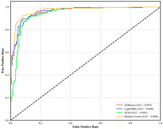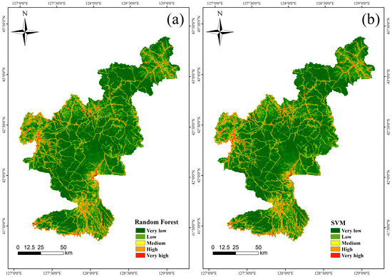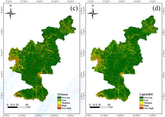 The ability of the models to distinguish between different hazard categories was further assessed by calculating the ratio of the total frequency ratio for the high- and very-high-hazard zones relative to the sum of the total frequency ratios. As shown in Table 5, the frequency ratios for all four models were below 1 in the very-low-, low-, and medium-hazard zones, indicating strong predictive performance. In contrast, the Random Forest (RF) model achieved frequency ratios of 2.773 and 8.345, with an accuracy of 0.903 in the high- and very-high-hazard zones, respectively. The Support Vector Machine (SVM) model produced frequency ratios of 1.605 and 3.061, with an accuracy of 0.734, while the XGBoost model had frequency ratios of 1.935 and 12.954, respectively.
