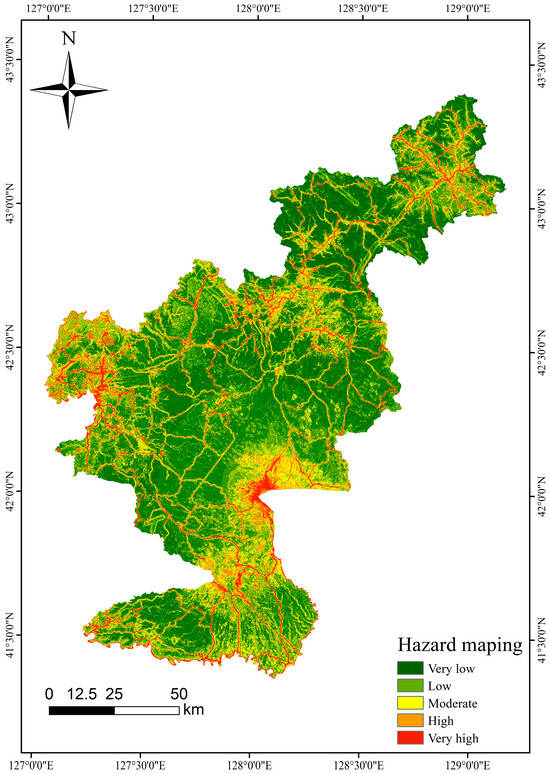 Hazard is the primary element in collapse geohazards. Hazard assessment primarily involves two aspects: the spatial probability and temporal probability of disaster occurrence. Spatial probability refers to the likelihood of an occurrence at specific locations under the condition of an induced event, i.e., susceptibility; temporal probability refers to the frequency or intensity of the induced factor [45]. According to the hazard definition, for the triggering factor of volcanic earthquakes, the product of susceptibility and the probability of exceeding the threshold of volcanic earthquakes is used to model hazard assessment.