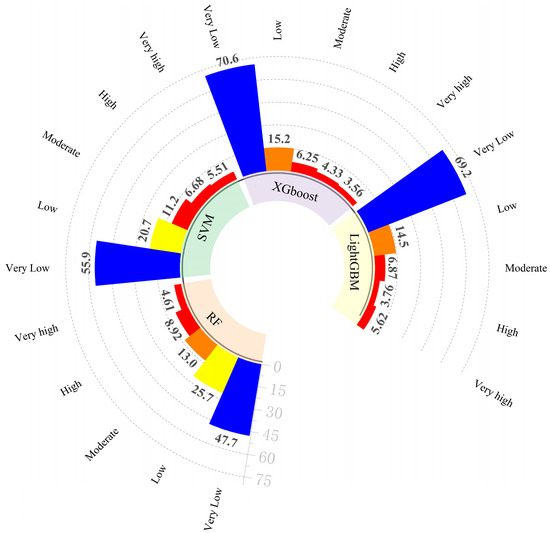 Figure 9 presents the distribution of raster proportions across four models at varying hazard levels. The XGBoost model predicts the following proportions: very low (35.46%), low (29.65%), medium (18.37%), high (11.17%), and very high (5.33%). In comparison, the Random Forest (RF) model produces the following proportions: very low (33.93%), low (29.38%), medium (18.61%), high (13.77%), and very high (4.31%). The Support Vector Machine (SVM) model yields the following proportions: very low (26.53%), low (25.97%), medium (20.40%), high (14.74%), and very high (12.33%). These results suggest that both the XGBoost and RF models demonstrate a higher sensitivity in predicting low-risk areas while adopting a more conservative approach for high-risk regions.