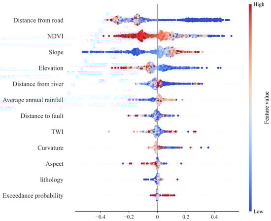 In the present study, the marginal effect methodology outlined by SHAP was employed to conduct a comprehensive analysis of the contribution of each evaluative factor within the XGBoost model concerning the incidence of collapse. As shown in Figure 10, the color bars represent the actual values of each factor, while the horizontal axis illustrates the distribution of SHAP values. A positive SHAP value indicates that a particular factor has a beneficial effect on the likelihood of collapses, whereas a negative value suggests a detrimental impact. Specifically, elevation, the NDVI, and distance to rivers and roads are negatively correlated with collapse incidence. This suggests that these factors may reduce the risk of collapse under specific conditions or ranges. Elevation may reduce collapse risk by influencing water flow patterns and soil stability, while the NDVI may influence this through the stabilizing effect of vegetation cover. Distance to rivers and roads may reflect the effects of topography and human activities. In contrast, faulting and stratigraphic lithology are positively correlated with collapse probability. This is likely due to the fact that fault activity increases geological instability, while specific lithologies are more susceptible to weathering and disintegration, thus increasing the risk of collapse.