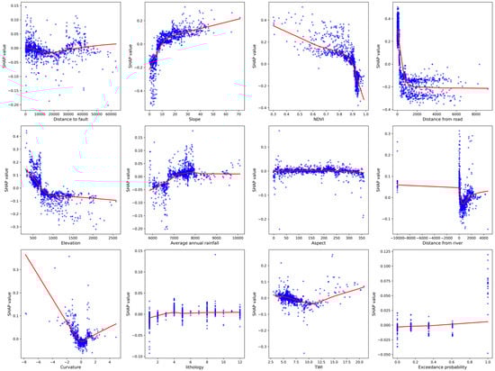 Areas within 0–10,000 m from the fault exhibit higher positive SHAP values, and as the distance increases (>20,000 m), the impact gradually stabilizes and slightly increases, suggesting that proximity to the fault increases collapse susceptibility, likely due to tectonic activity and geological fragmentation zones. The slope gradient exhibits a clear positive correlation with collapse incidence. When the slope gradient is between 0 and 10 degrees, SHAP values rise rapidly, and the impact continues to increase gradually beyond 20 degrees, suggesting that slope gradient is a key factor influencing collapse occurrence, with steeper slopes being more susceptible. NDVI values exhibit a negative correlation when ranging from 0.3 to 0.8, with SHAP values significantly decreasing as the NDVI approaches 1 (high vegetation cover), indicating that greater vegetation cover reduces collapse risk. Within 0–2000 m from the road, SHAP values decrease sharply and level off beyond 2000 m, indicating that human activities (such as road construction) significantly influence collapse risk in the proximal zone. Higher positive SHAP values are observed at low elevations (<500 m), with the effect gradually decreasing and becoming negative as the elevation increases, likely due to topographic features and climatic conditions. Positive impacts were observed in the range of 7000–8000 mm, with relatively low impacts at both very low and very high rainfall, suggesting that moderate rainfall increases collapse risk. Slope orientation has a relatively minor effect on collapses, with minimal fluctuation in SHAP values and a nearly horizontal curve, indicating that it is not a determining factor. Significant variation in impacts was observed near 0 m from the river, with stabilization after moving beyond 2000 m, suggesting that fluvial erosion significantly influences collapse risk in the immediate area. The range from −2 to 2 exhibits a significant U-shaped relationship, with extreme curvature values (both positive and negative) showing higher SHAP values, indicating that concave and convex terrain variations significantly influence collapse occurrence. Different lithological types exhibit smaller variations in SHAP values, with a slight overall increase, suggesting that lithology has a relatively minor effect on collapses.