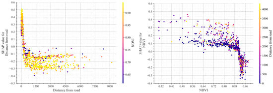 Figure 12 illustrates the interaction between road distance and the NDVI in relation to collapse hazard. In the proximal zone (0–2000 m), SHAP values exhibit significant fluctuations (−0.3 to 0.5), showing maximum sensitivity to NDVI variations, indicating the critical zone for collapse hazard. The transitional zone (2000–4000 m) shows a convergence of SHAP values to a narrower range (−0.15 to −0.1), indicating attenuated road disturbance and moderated NDVI effects. In the distal zone (>4000 m), SHAP values stabilize with significantly reduced fluctuations, suggesting substantially diminished road influence.