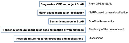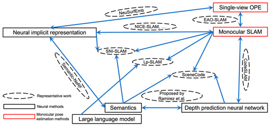Robotic monocular pose estimation is more comprehensive than monocular pose estimation, which includes camera and object pose estimation. The accuracy of camera pose estimation decides the quality of a 3D map, and the accuracy of object pose estimation decides the fineness of a 3D map. Without reliable and accurate pose estimation, it is impossible to obtain a precise map to require the related applications. Robotic monocular pose estimation methods should be the core of robotic applications that decide the quality of 3D maps. An accurate perception of robots requires accurate robotic monocular pose estimation for robots and objects. Single-view/multi-view OPE mainly focuses on object pose solving and has a relation with monocular SLAM, as illustrated in Section 2.2. Single-view OPE and monocular SLAM are driven by neural methods, including depth prediction neural network, semantics, neural implicit representation, and LLMs []. The structure of the survey is shown in Figure 1.