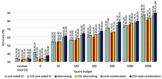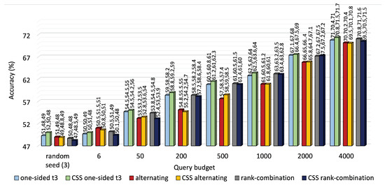 Performance comparison of one-sided, alternating and RC selection against their CSS versions for KU-HAR. One-sided selection is depicted with task 2 as reference since it showed best results among others. Average accuracy across 3 tasks improved at 2000 queries from 86% to 89.1% when CSS was launched with RC sampling. The bars indicate average of three task accuracy numbers above them.