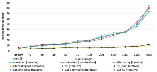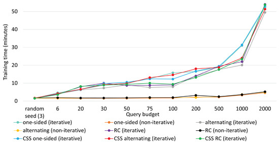 Lastly, we compared training times for the aforementioned methods in Figure 9 and Figure 10, respectively for the two datasets. Note that training time includes sampling time as well, be it an iterative process or a non-iterative one. Thereby, all the iterative mini-batch methods exhibited higher training time. In contrast, the non-iterative ones were trained faster, as new knowledge was not considered to sample critical instances and no repetitive interplay took place between the agent and the annotator.