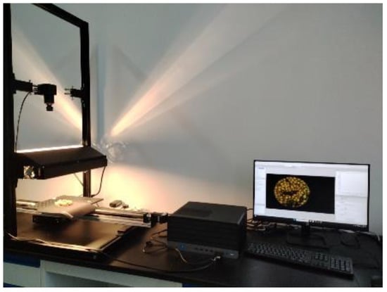 The spectral imaging system consists of a Pika L spectrometer (Resonon, Bozeman, MT, USA), a halogen light source, a sample stage, a sample scanning motion control system, and a computer (Figure 2). The Pika L spectral acquisition range is 400 nm to 1000 nm, with a spectral resolution of 2.7 nm, 281 spectral channels, and a sampling interval of 1.07 nm. The spectral acquisition software used is Spectronon Pro (Resonon, Bozeman, MT, USA, version 3.4.10). The sample stage moves at a speed of 3.426 cm·s−1 to ensure that image distortion does not occur during the line scanning process. After preheating the halogen light source for 20 min, spectral data are collected, according to the standard procedure of the spectral acquisition system. A whiteboard is used to calibrate spectral data. The dark current is corrected through preprocessing using Spectronon Pro. Three sets of images were collected for each sample by rotating it to change its relative position to the camera. A total of 300 raw spectral data were obtained.