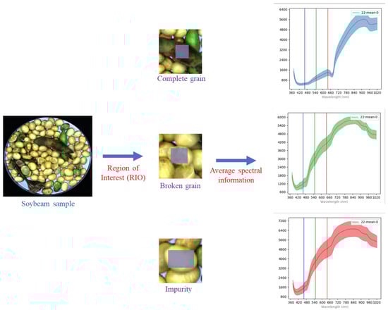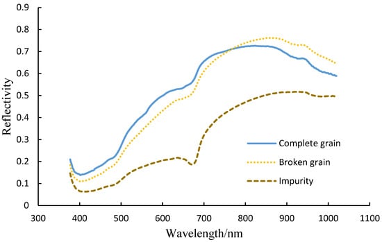 SpectrononPro spectral analysis software was used to extract the regions of interest (ROI) from the spectral images of intact grains, broken grains, and impurities of soybeans. As shown in Figure 3, a square region with a side length of 200 pixels was selected as the ROI, and the average spectrum of the ROI was extracted as the spectral information for that category of soybean sample. A total of 1192 sets of spectral data were extracted, including 513 sets for intact grains, 256 sets for broken grains, and 423 sets for impurities. Figure 4 shows a set of spectral information graphs for different soybean components. The surface of intact soybeans is relatively smooth and exhibits more uniform optical properties. The edges and surface structures of broken soybeans are more complex, causing more light scattering and resulting in a reflection spectrum different from that of intact soybeans. Impurities have more irregular concave and convex shapes on their surfaces, causing additional scattering of light upon contact, leading to significant changes in the spectral reflectance []. Furthermore, inconsistencies in the moisture content levels of the three components also contribute to differences in spectral reflectance. These variations provide valuable data support for the identification of soybean components.