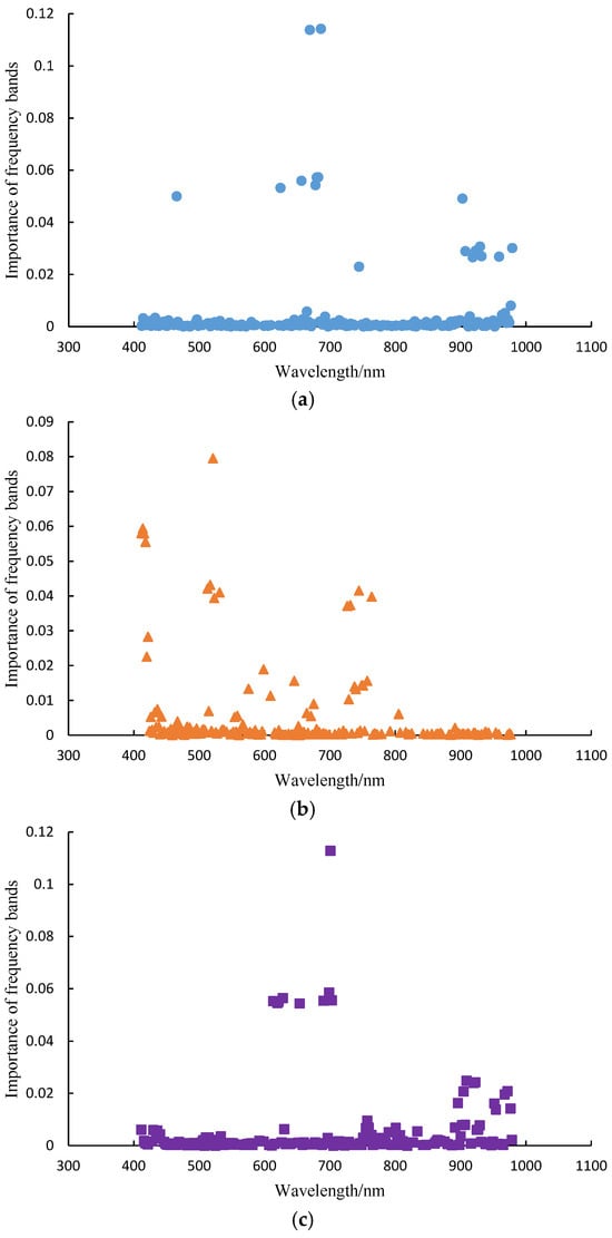 Figure 5 shows the spectral band importance when constructing the RF soybean component classification model, based on different preprocessed spectral data. In the modeling process using the original data, the top three spectral bands with the highest contribution rates were 686.12 nm, 668.96 nm, and 681.84 nm, with contribution rates of 0.1143, 0.1138, and 0.0573, respectively. The cumulative contribution rate was 0.2854. For the BC preprocessed spectral data, the top three spectral bands with the highest contribution rates were 521.08 nm, 413.81 nm, and 411.77 nm, with contribution rates of 0.0795, 0.0594, and 0.0581, respectively. The cumulative contribution rate was 0.1970. For the normalization preprocessed spectral data, the top three spectral bands with the highest contribution rates were 701.18 nm, 699.03 nm, and 628.43 nm, with contribution rates of 0.1128, 0.0586, and 0.0565, respectively. The cumulative contribution rate was 0.2279. From this, it can be seen that among all the spectral bands, some bands play a decisive role in modeling, while others have no positive significance for modeling. Therefore, while ensuring detection accuracy, it is possible to attempt to reduce the dimensionality of the spectral data and decrease the computational complexity of the model by extracting feature wavelengths.