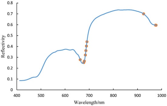 Figure 8 shows the process of extracting feature wavelengths from the original spectral data using the CARS algorithm. When the number of feature wavelengths is 10, the RF soybean composition classification model achieves the highest accuracy of 0.9874. The optimal feature wavelengths obtained using the CARS algorithm are shown in Figure 9. The 10 feature wavelengths are 688.28 nm, 683.98 nm, 662.54 nm, 925.11 nm, 690.42 nm, 686.12 nm, 976.78 nm, 974.53 nm, 679.68 nm, and 677.54 nm, accounting for 3.77% of the total wavelength range.