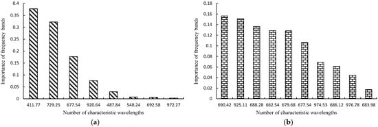 Figure 10 shows the importance of spectral bands in the RF soybean component classification model based on DE-SPA-BC and DE-CARS preprocessed spectral data. For the DE-SPA-BC preprocessed spectral data modeling, the top three bands with the highest contribution rates were 411.77 nm, 729.25 nm, and 677.54 nm, with contribution rates of 0.3777, 0.3223, and 0.1768, respectively, resulting in a cumulative contribution rate of 0.8768. For the DE-CARS preprocessed spectral data modeling, the top three bands with the highest contribution rates were 690.42 nm, 925.11 nm, and 688.28 nm, with contribution rates of 0.1565, 0.1510, and 0.1367, respectively, resulting in a cumulative contribution rate of 0.4441.