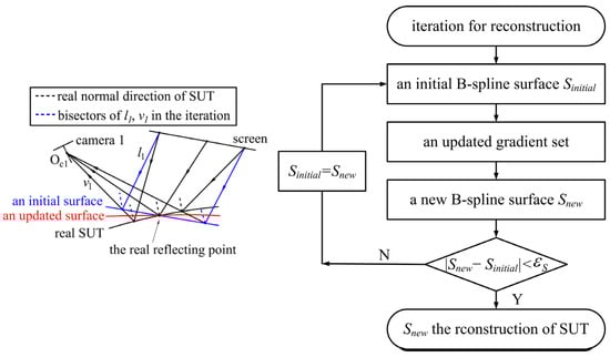 In this paper, a deflectometric iterative reconstruction method is proposed to increase the noise robustness of the mechanism and to extend the mechanism to the measurement of the separate SUT. Some locally defined functions, like the B-spline function, are more suitable for fitting discontinuous surfaces than the globally defined functions, such as the polynomial function. By discarding the basic functions of the B-spline surface that link the discontinuous surfaces and the corresponding control points, it is possible to represent the discontinuous surfaces using a single mathematical formulation in the form of the B-spline surface. With the SUT modeled with the B-spline surface, the mechanism is analyzed mathematically, verifying that the single reflecting point can be replaced with the sparse point cloud of the SUT to increase the robustness of the methods. With the modeled SUT, the B-spline surface makes it possible to iteratively reconstruct the separate SUT based on the mechanism. In the iteration process, the x, y components of the coordinate of reflecting points in the camera coordinate system are variant, different from the fixed x, y components calculated with stereo-PMD in Ref. []. Thus, according to the updated slopes, a new method of reconstructing the SUT in the form of the B-spline surface in every iteration process is proposed.