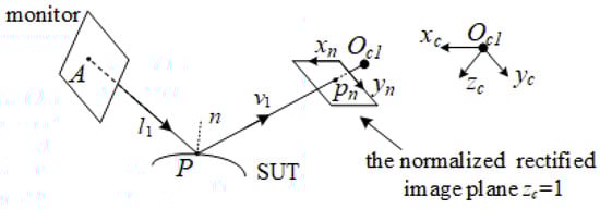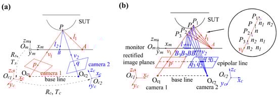 After the calibration of the stereo-PMD system, the intrinsic matrixes Ki (i = 1, 2) of the cameras, the rotation matrix Rc, and translating vector Tc between the camera coordinate systems (Oc-xc-yc-zc), the Rm and Tm between camera 1 and the monitor coordinate system (Om-xm-ym-zm) are obtained, as illustrated in Figure 2a. According to Rc and Tc, images of the cameras are rectified [] to make the epipolar lines and rows of pixels colinear, as illustrated in Figure 2b where the procedure of solving a reflecting point is conducted. According to Rm, Tm, and the rotation matrix of the rectification, the pixel coordinate on the monitor is transformed into the coordinate system of the rectified camera 1 in Figure 2b. With the unwrapped phase [,], the correspondence between the pixels of the cameras and the monitor can be established, such as p and A, q and B. Based on the law of reflection, the bisectors ni (i = 1, 2) of the incident and emergent lights li, vi should be coincident at the reflection point P, which is the normal direction n of the SUT at P. It is the criterion to match the base integer pixel p with its homologous pixel q. Along the epipolar line (the same row of p in camera 2), sub-pixel coordinate q, which corresponds to the largest consistency of the bisectors among q and qj (j = 1, 2, 3), is the sub-pixel homologous pixel of p. The iterative matching method in [] can be applied to match q and p. With q and p, the coordinate of P(xc, yc, zc) can be calculated with triangulation.