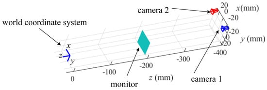 To verify the proposed method in actual measurement, a system of stereo-PMD was set up with two cameras (DAHENG IMAGING, MER2-503-36U3M, resolution: 2448 × 2048, pixel size: 3.45 µm × 3.45 µm) and a computer monitor (DELL E1715S). With the assistance of a plane mirror, the system was calibrated with the calibration methods in [,] to obtain Ki (i = 1, 2), Rc, Tc, Rm, and Tm.