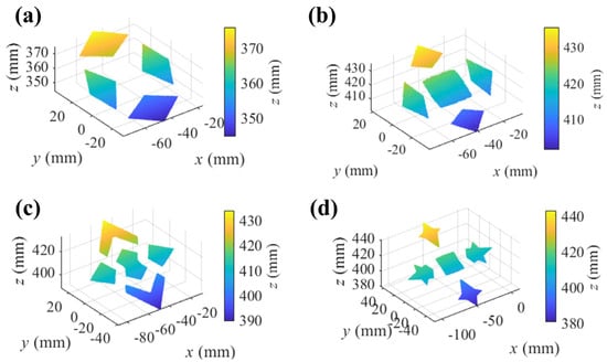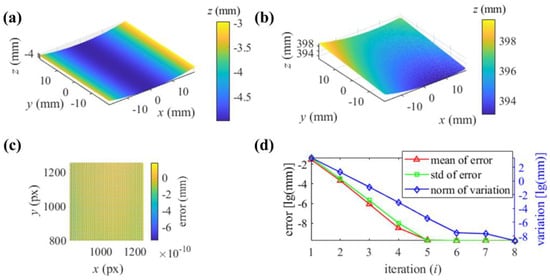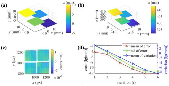 In measuring the separate SUT, four reflecting points with the real coordinates, respectively, on the planes are used to scale C1, …, and C4, respectively. The reconstruction of the SUT, the error of the depth, and the process of iteration are illustrated in Figure 6b–d, respectively. From Figure 6c, the rmse of the iterative reconstruction is 4.8694 × 10−12 mm. The accuracy of the iterative reconstruction method and its mechanism can be verified with the simulation.