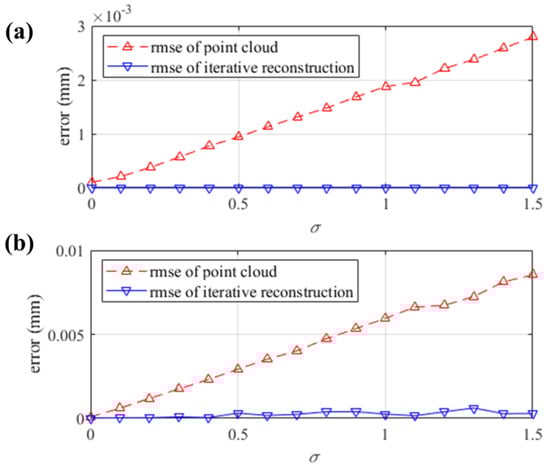 However, disturbed by noise, the real coordinates of the reflection points can be obtained in actual measurement. With the std of image intensity around 126, the ideal fringe patterns are generated by the spatial geometric relationship of the simulated system. With the std varying from 0 to 1.5, two-dimensional Gaussian noise is introduced to the ideal fringe patterns. The minimum signal-to-noise ratio of the noisy patterns is around 19.2 dB. With the noisy patterns, the simulated stereo-PMD is employed to obtain the sparse point cloud of the SUTs with the base pixel interval of 10 pixels (pxs). The control points of the B-spline surfaces in every iteration process are scaled by the point cloud according to Equation (4). Figure 7 shows the rmse of the sparse point cloud and the iterative reconstruction compared to the ground truth of the simulation, demonstrating the robustness of the iterative method.