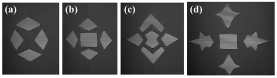 Horizontal fringe patterns, respectively, reflected with four SUTs and recorded with camera 1. (a) Reflected pattern with SUT 1; (b) reflected pattern with SUT 2; (c) reflected pattern with SUT 3; (d) reflected pattern with SUT 4.